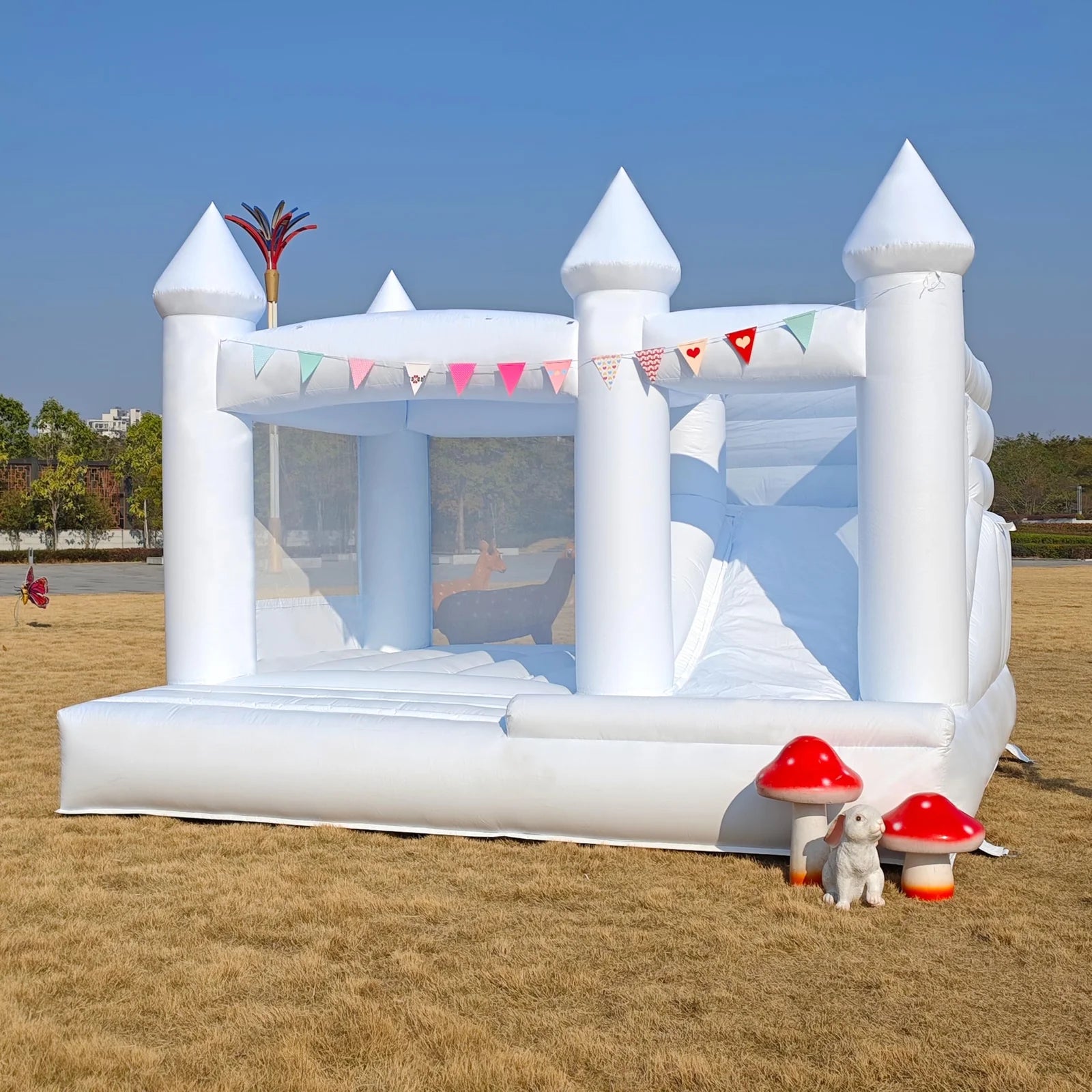 This extra-large inflatable bounce house comfortably fits multiple users at once. It features a built-in slide for added fun and a stylish castle-like design that also makes it a beautiful backdrop for photos.